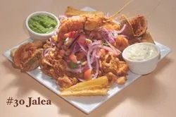 Family size. A mixture of lightly breaded and fried fish, shrimp, clams, muscles, squid & yuca, garnished with a salsa criolla, our lime marinated red onions on top.