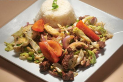 Lean sliced beef stir fried with chopped white cabbage, red onions, and tomatoes. Served with garlic steamed rice.